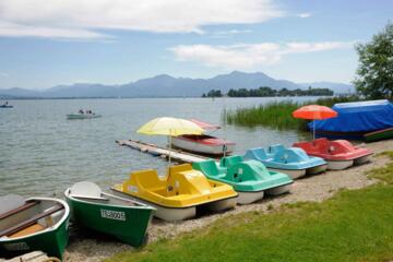 Der Chiemsee, auch das "Bayerische Meer" genannt, bietet unzählige Freizeitmöglichkeiten. Wassersportler genießen Segeln, Surfen und Bootfahren, während zahlreiche Strandbäder, wie das nahe gelegene Seebruck, zum Sonnenbaden einladen. Das gut ausgebaute Radwegenetz führt entlang des Ufers und bietet herrliche Ausblicke. Kulturelle Highlights wie Schloss Herrenchiemsee und die Fraueninsel mit dem Kloster Frauenwörth sind beliebte Ausflugsziele, und eine Schifffahrt über den See ist ein Erlebnis für sich.