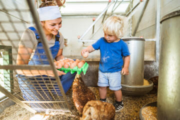 Unser Kleintierhaus steht dir jederzeit offen. Bei dessen Bau haben wir auf heimisches Holz und traditionelle Bundwerkbauweise gesetzt und mit Handwerkern aus der Region zusammengearbeitet. Im Inneren befindet sich eine Empore, von der aus du den Hof und die Tiere von oben beobachten kannst. Und für die Mutigen unter euch: Auf der Empore kann man auch übernachten! Die Tiere freuen sich über euren Besuch!