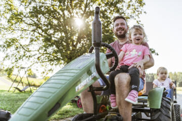 Sicher unterwegs auf dem Hof - Der Hof liegt ruhig und sicher inmitten von grünen Wiesen und Feldern, sodass die Kinder ohne Sorge um Autos oder LKWs quer über das Gelände düsen können. Mal schneller, mal langsamer – hier haben die kleinen Entdecker genug Platz, um den Hof auf vier Rädern zu entdecken.