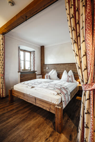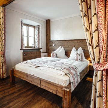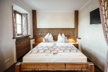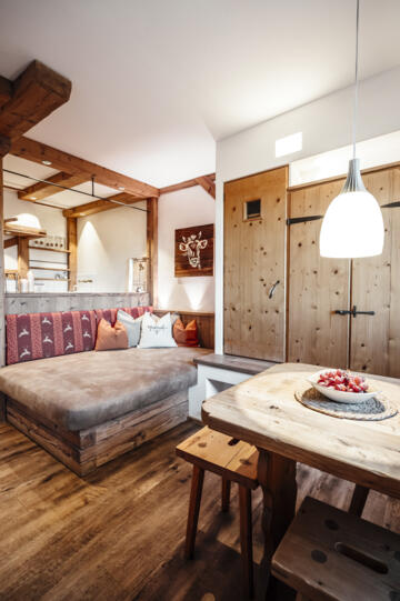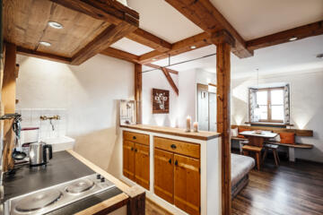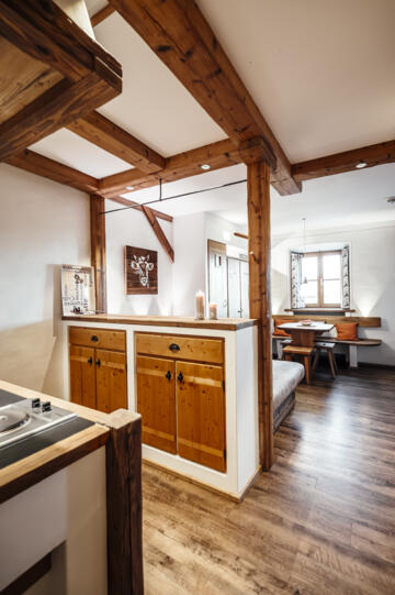 Das Appartement Gans im 1. Stock des alten Bauernhofs bietet einen behaglichen Wohn-Schlaf-Raum und eine voll ausgestattete Küchenzeile.