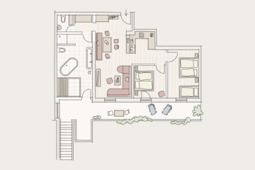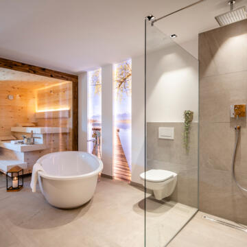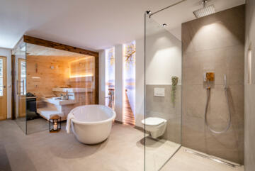 - Badezimmer: freistehende Badewanne, Sauna, Dusche, WC, und ein separates WC