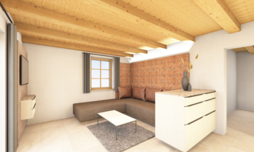 - Wohnraum: Großzügiger Wohnraum mit Holzbalkendecke, stilvoller Essbereich